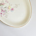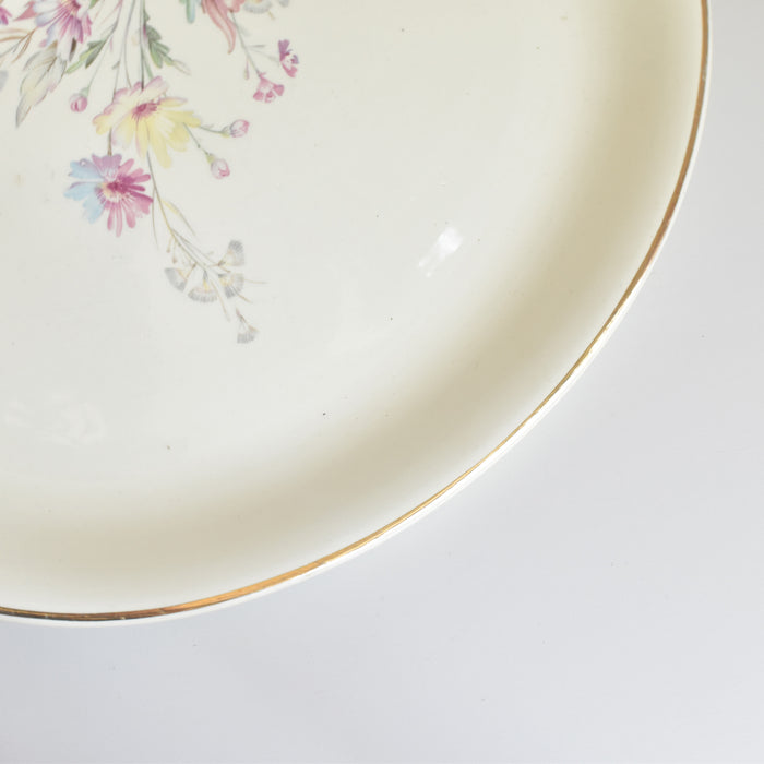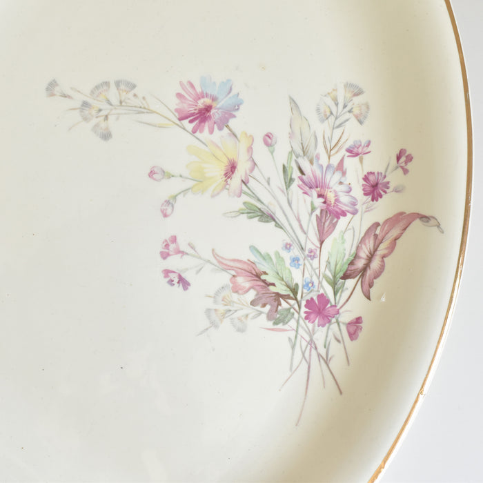 クリームがかった柔らかな色合いの素地に、可憐な花束が繊細なタッチで描かれており、その周囲には控えめな金彩が施されています。