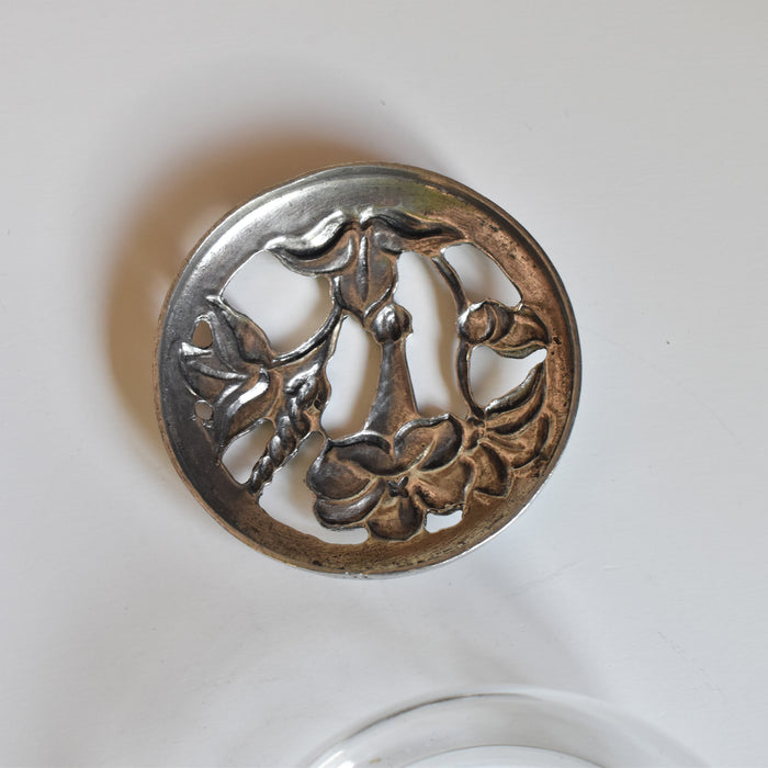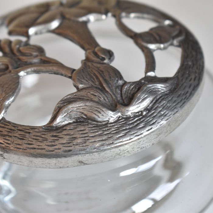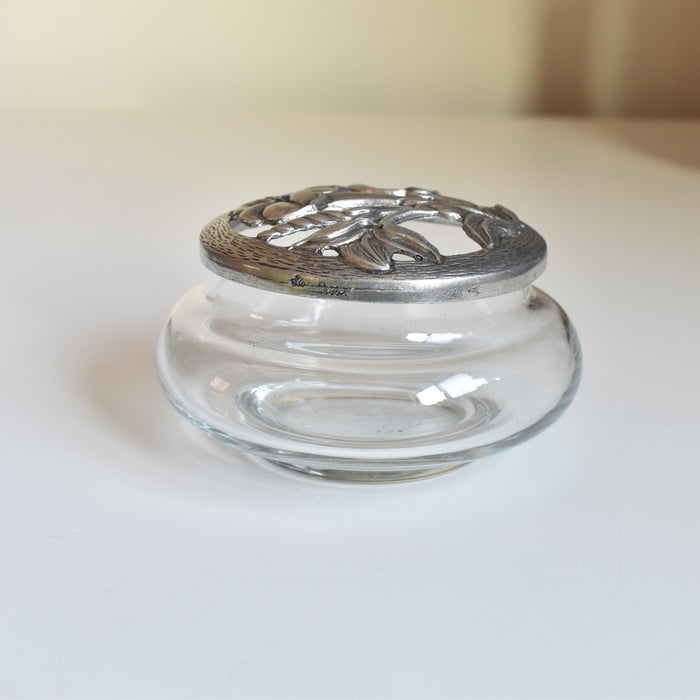 ピューター製の花模様の蓋と、透き通るガラスが相まった美しいポプリ入れです。