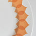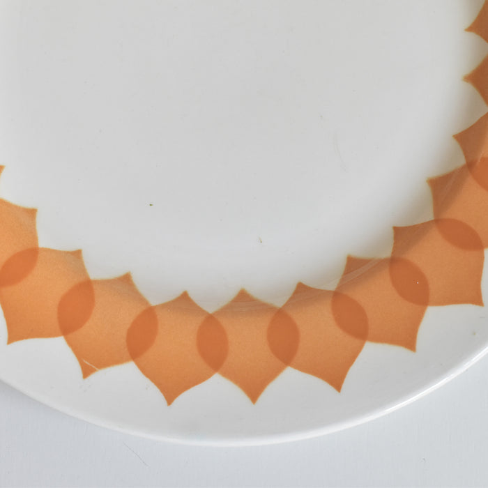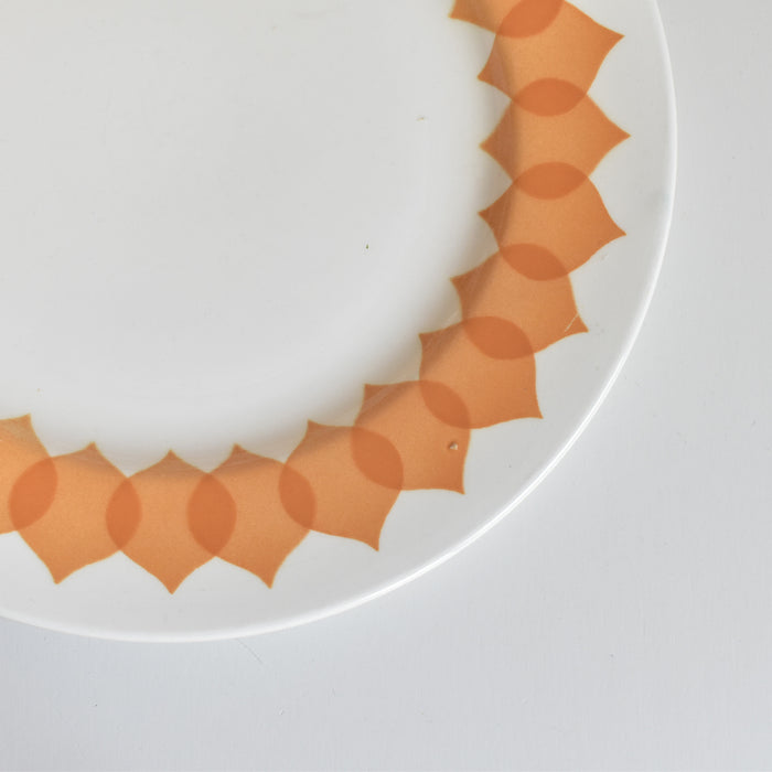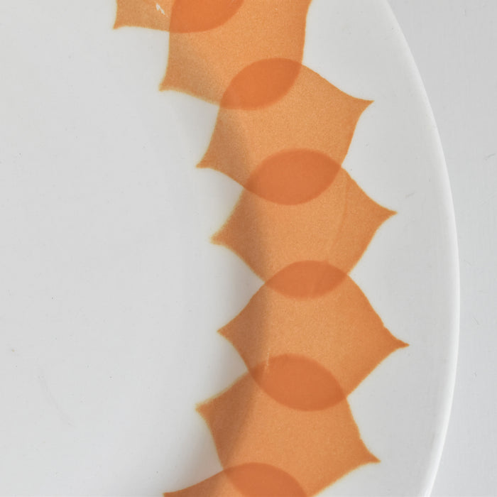 温かみのある白地に、美しいオレンジ色のリーフ型モチーフが、放射状に幾重にも重なるようにデザインされています。