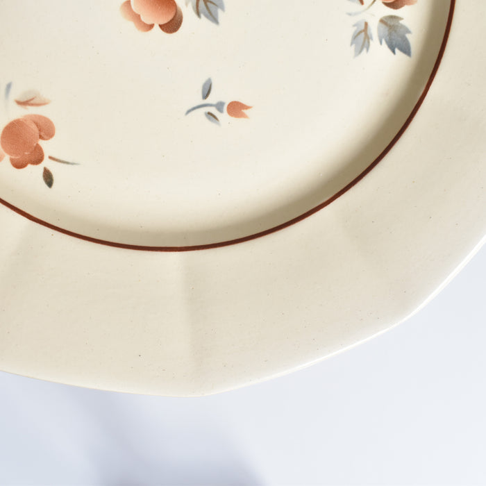 クリーム色のドデカゴン(12角形)のお皿にステンシルの青とオレンジの小さいバラが描かれています。