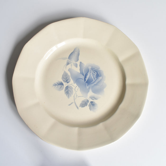 クリーム色のドデカゴン(12角形)のプレートにステンシルの青バラが描かれています。