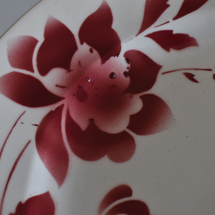 深く熟したワインのような赤色が目を引きます。描かれた花は、茎や蕾ととも美しくプレートに混ざり合っています。