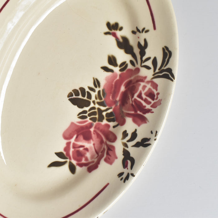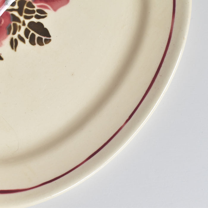 クリーム色の素地に、深みのあるワインレッドのラインと、同系色のシックなバラのモチーフが描かれた、上品で温かみのあるデザインが特徴です。