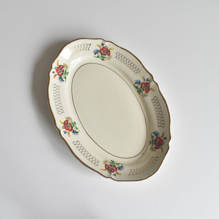 深紅のポピーや、ブルー、イエローの可憐な花が散りばめられ、全体のデザインに華やかさと懐かしさを添えています。