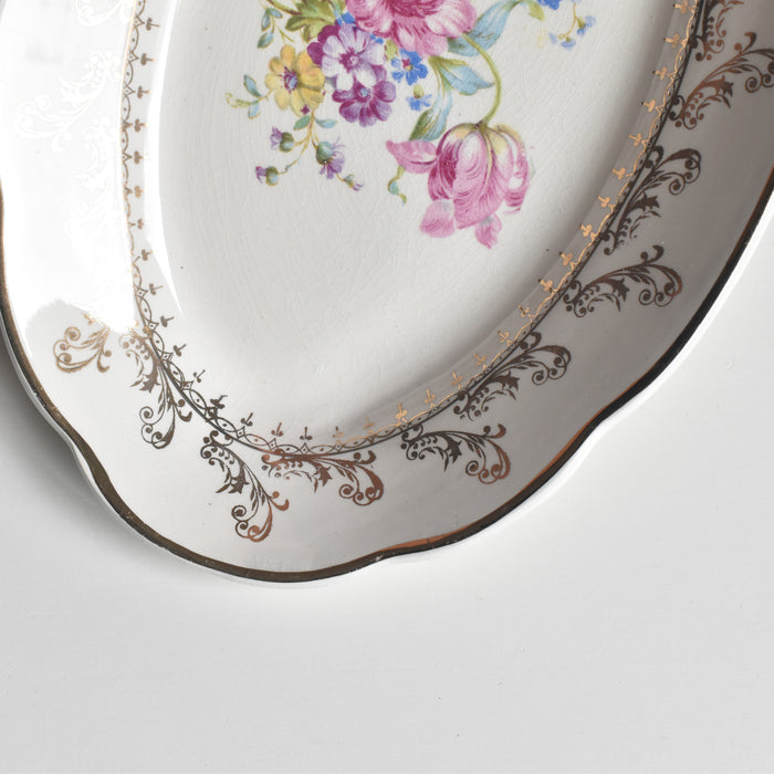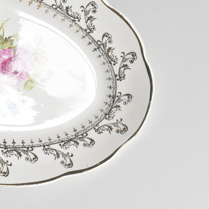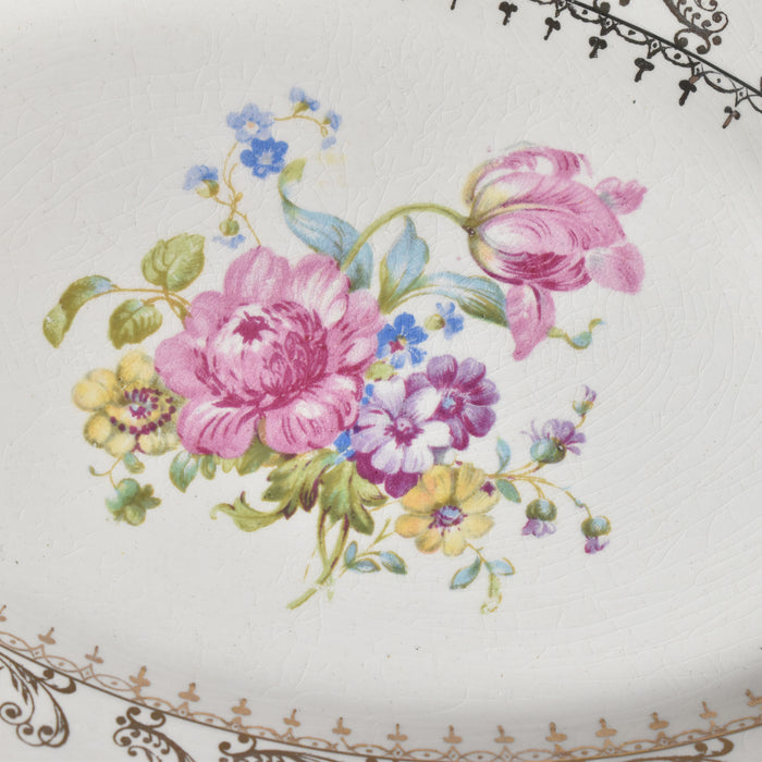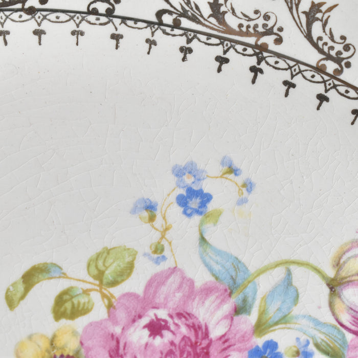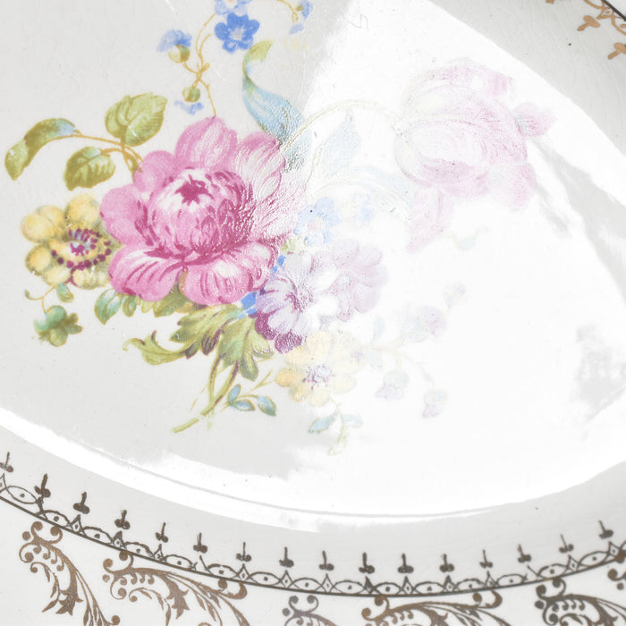 20世紀中期に作られたこの一枚は、温かみのある乳白色の肌に、繊細な金彩の縁取りと、生き生きとした花のプリントが美しく映えます。