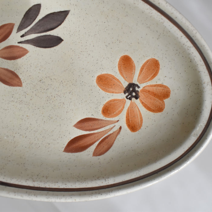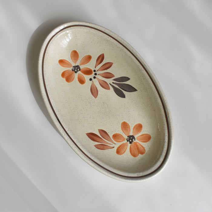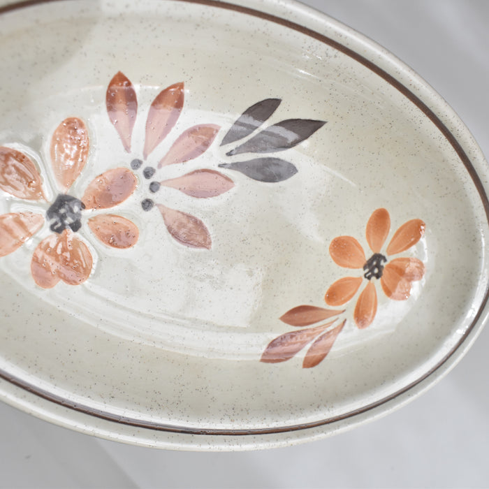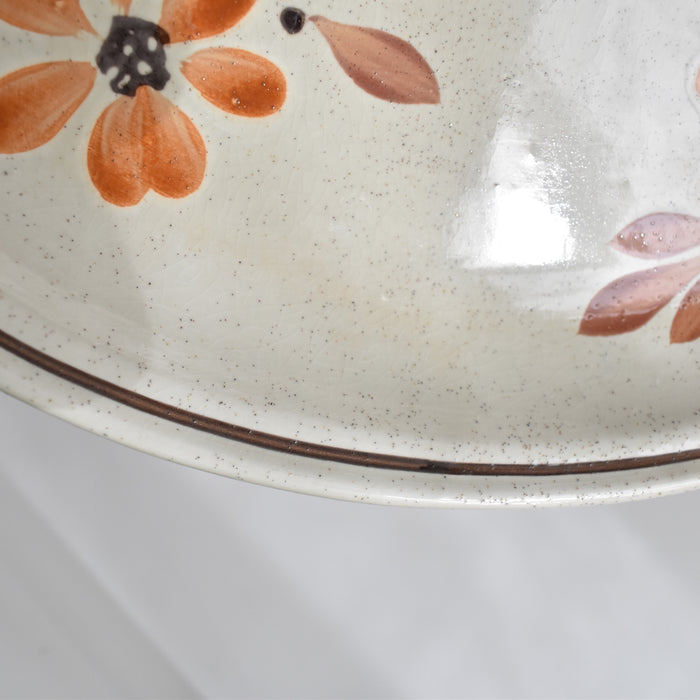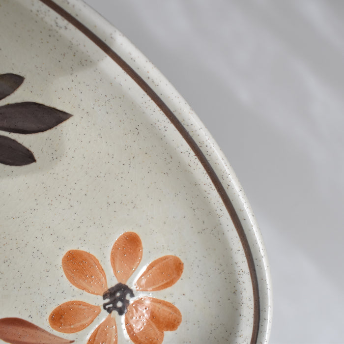 ストーンウエアの茶色いベースにハンドペイントの花が施されています。シンプルでシックなデザインです。