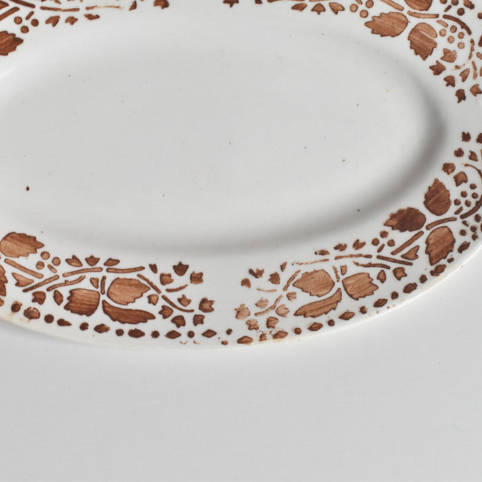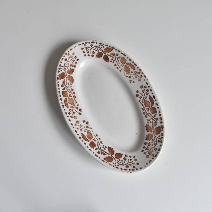 純白の素地を彩るのは、柔らかなブラウン系の色彩で表現された植物の模様。