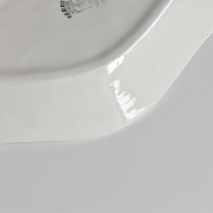 これらの模様はステンシル技法を用いて丁寧に描かれており、リムに沿って配されたドットとスクエアの縁取りも、アールデコ期らしい洗練されたデザインを際立たせています。