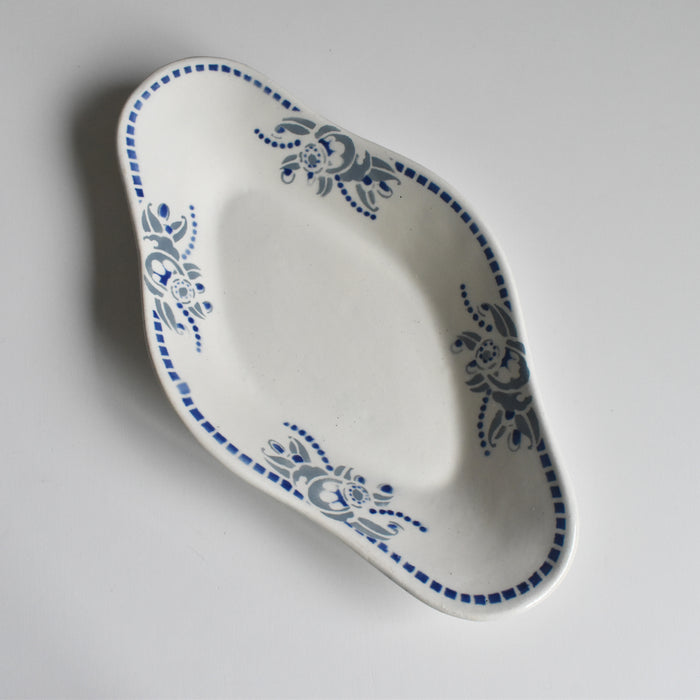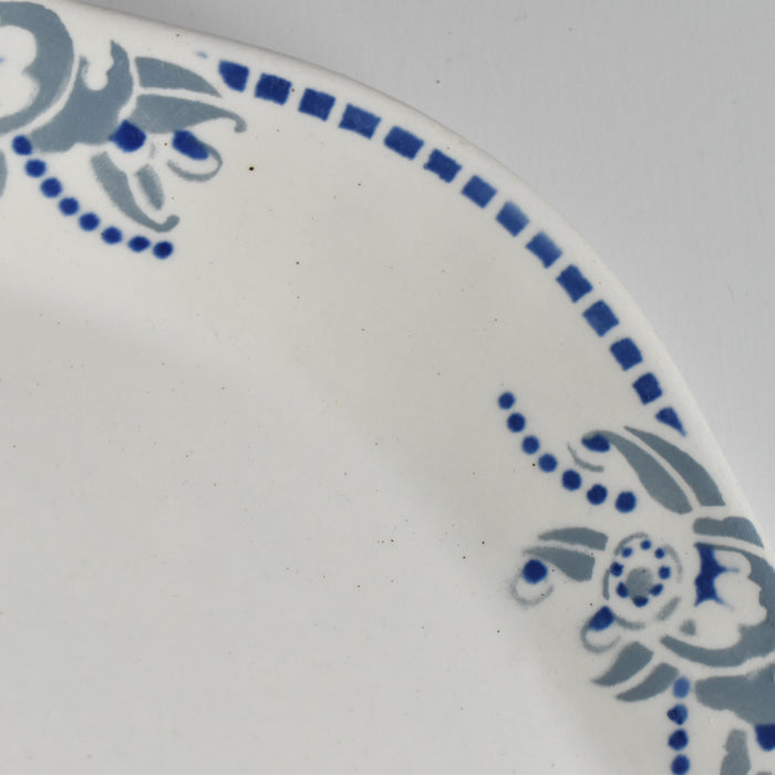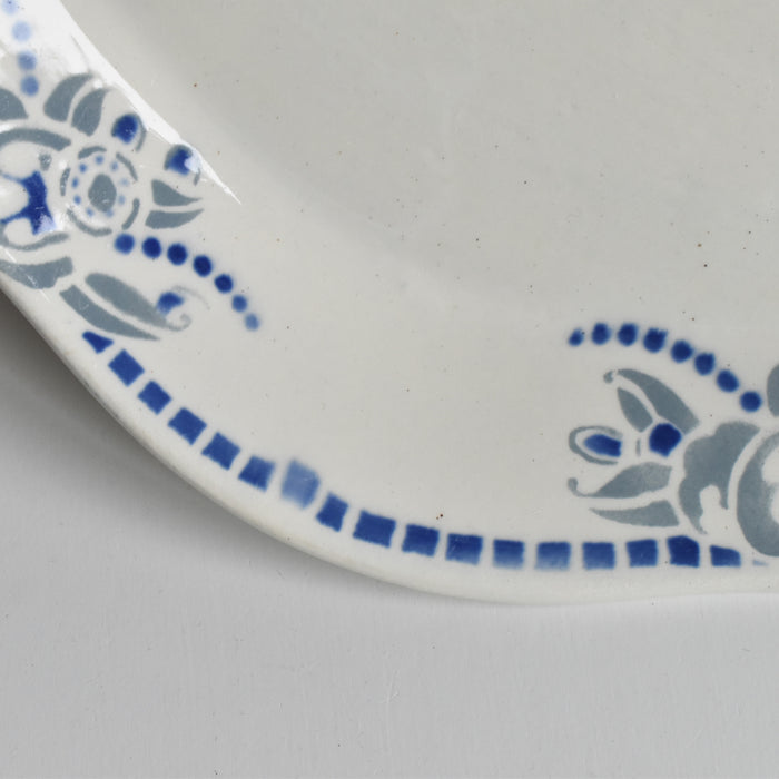 1920年代に作られたと推測されるこのラヴィエは、白地に鮮やかなブルーとグレーで描かれた、独特の幾何学的なフラワーモチーフが魅力です。