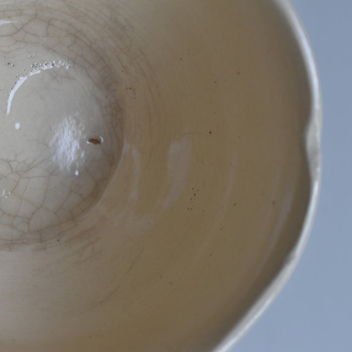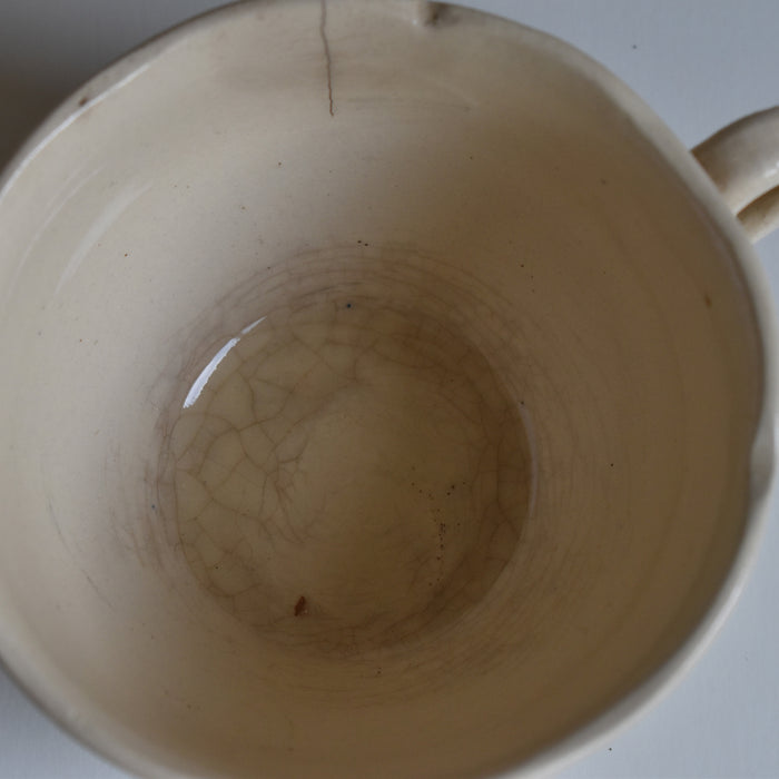 状態:カップの口縁部分にヘアラインやシミ、貫入、製造上の傷が見られます。ソーサーは大きいな傷はありませんが縁に擦れたような跡がございます。
