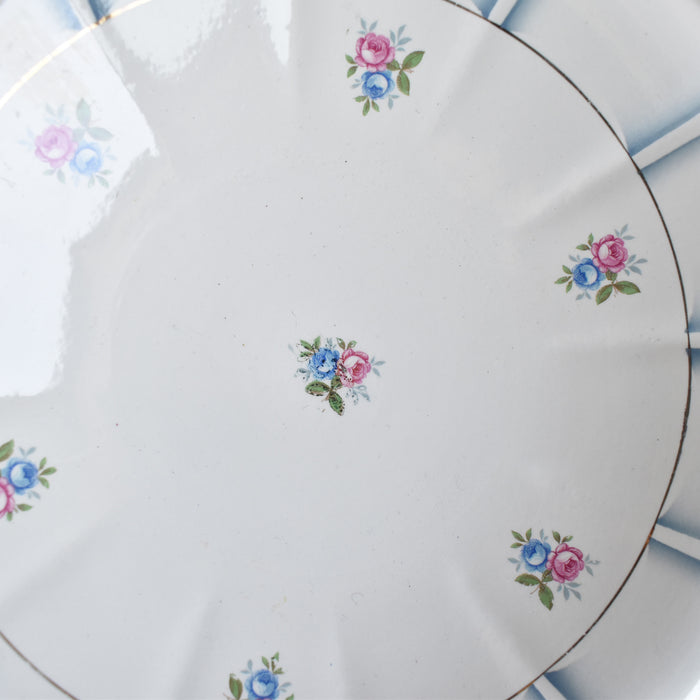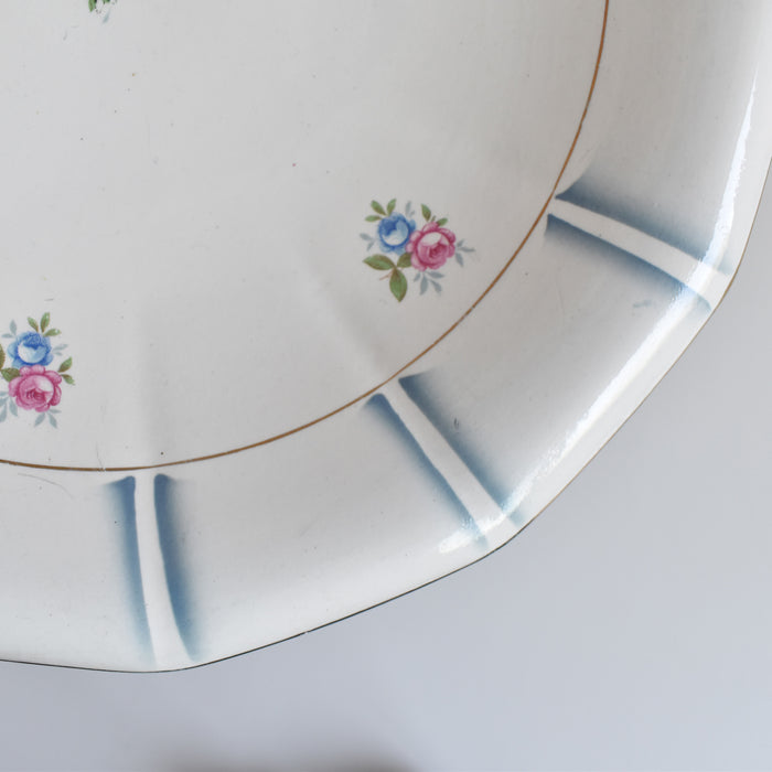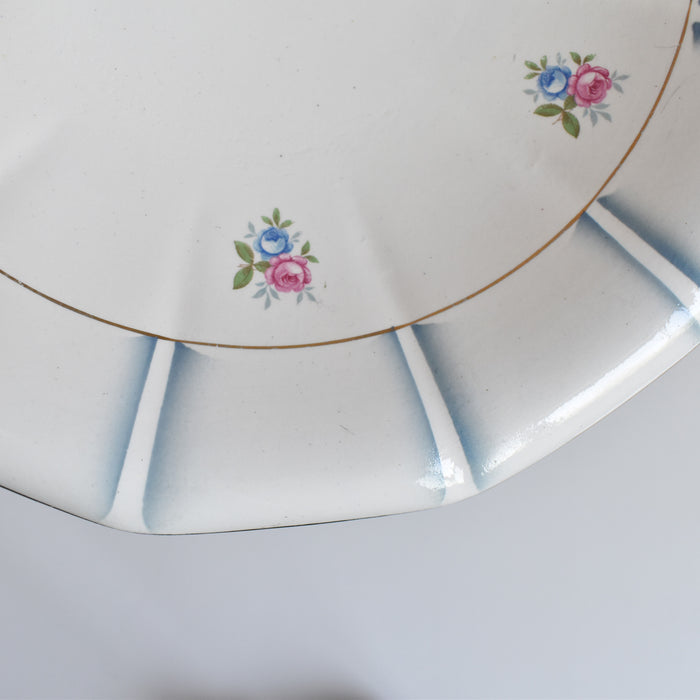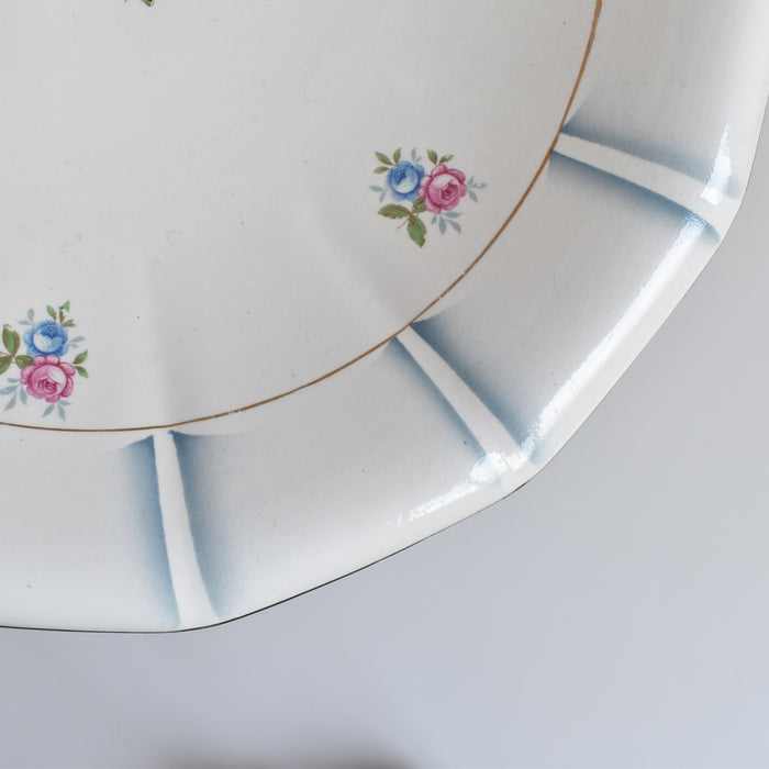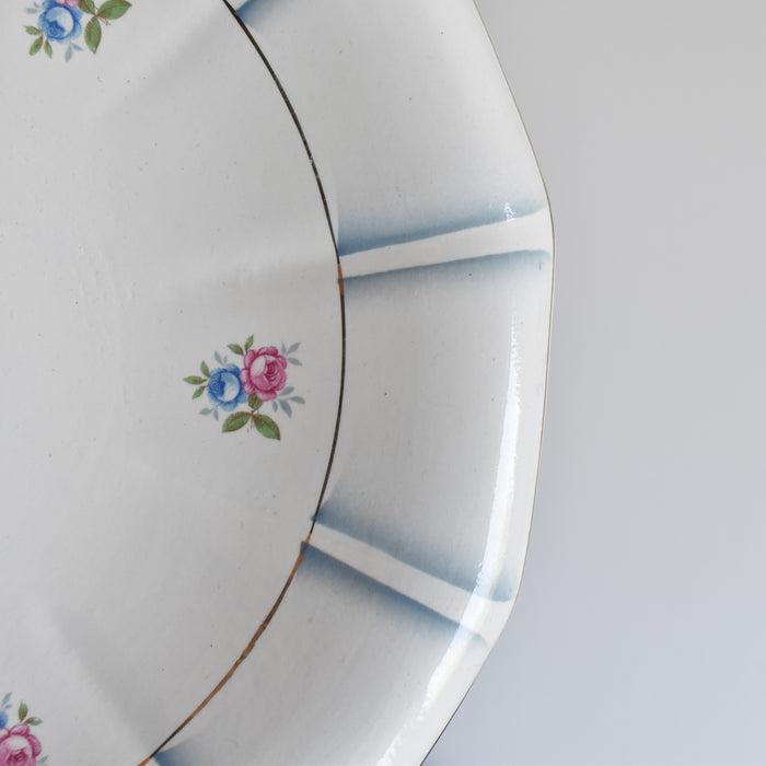 少し変わった形のドデカゴン(12角形)の深皿です。縁にスプレーのステンシルと小さい赤と青のバラのトランスファーが美しく調和した素敵な一品です。