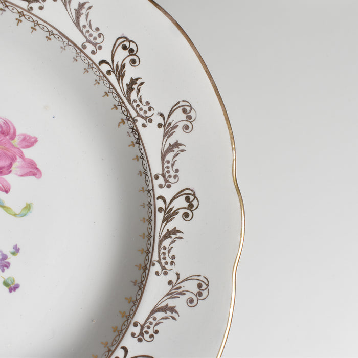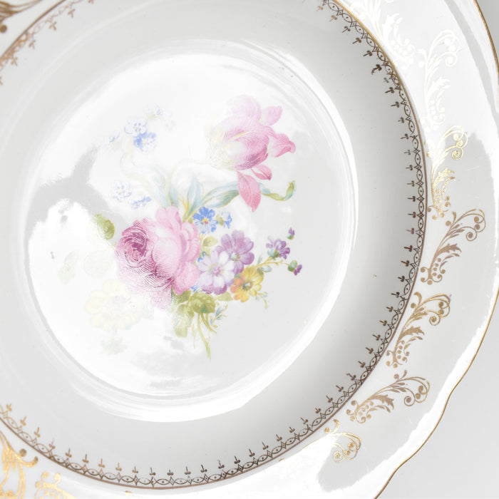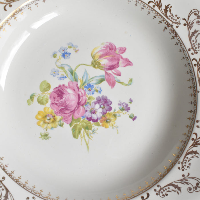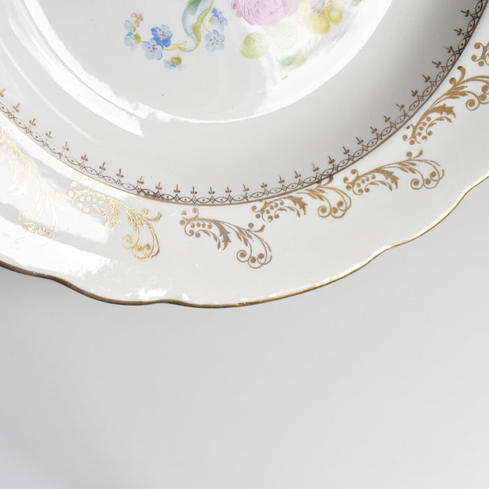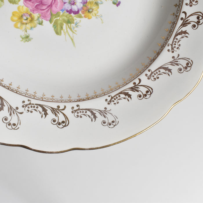 20世紀中期に作られたこの一枚は、温かみのある乳白色の肌に、繊細な金彩の縁取りと、生き生きとした花のプリントが美しく映えます。