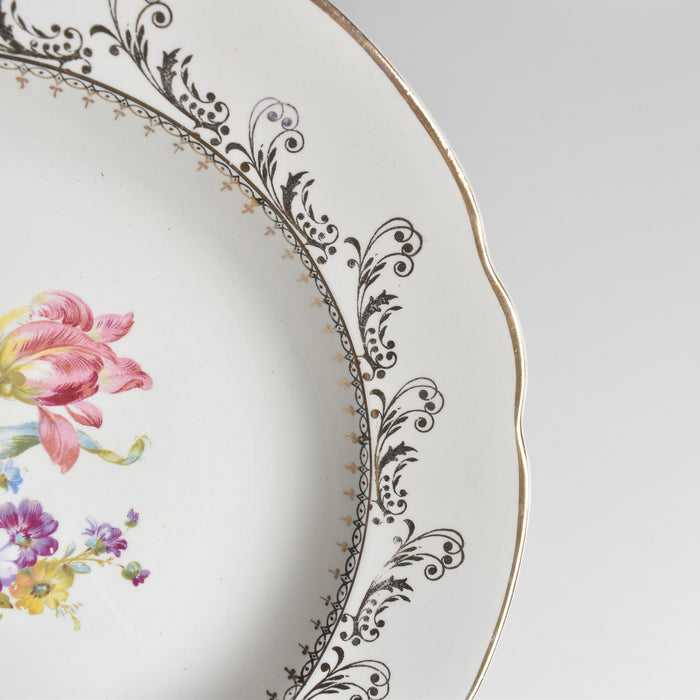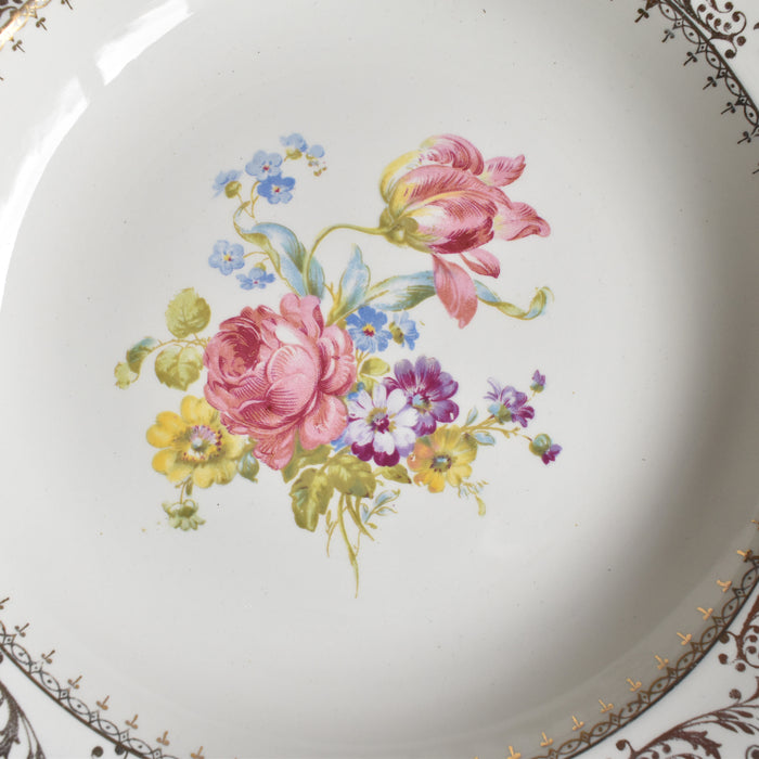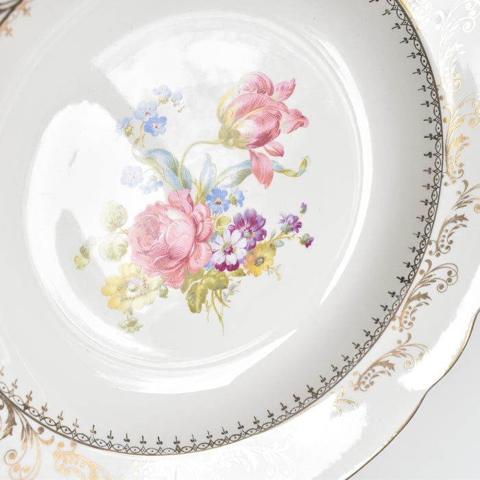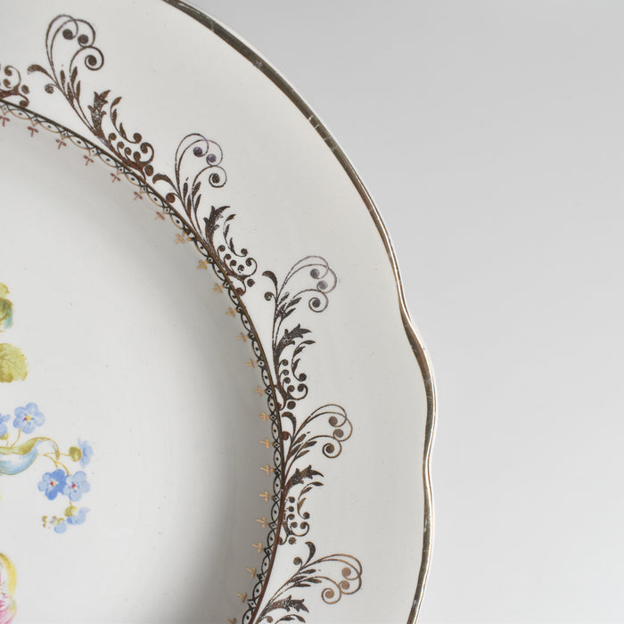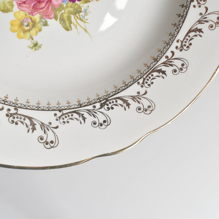 20世紀中期に作られたこの一枚は、温かみのある乳白色の肌に、繊細な金彩の縁取りと、生き生きとした花のプリントが美しく映えます。