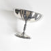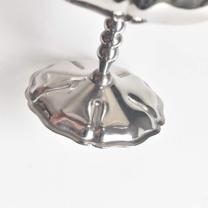 花びらのようなフリル状の縁と、華やかな装飾が施された台座が特徴的な、ステンレス製のアイスクリームクープです。