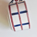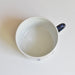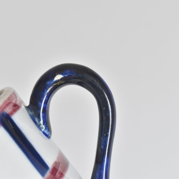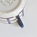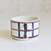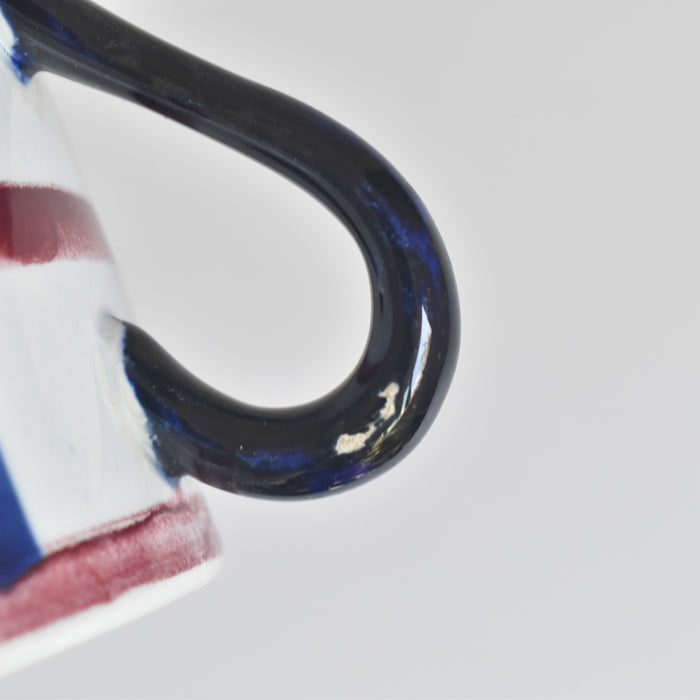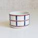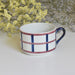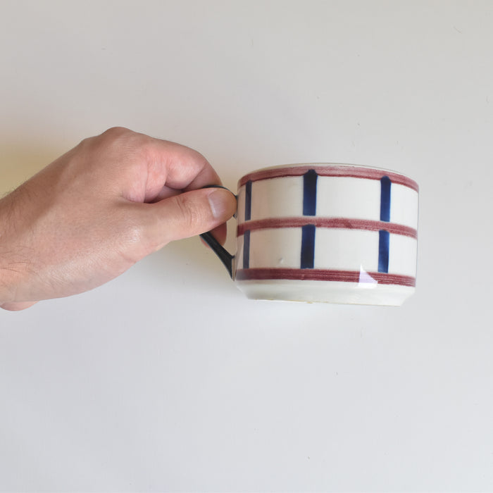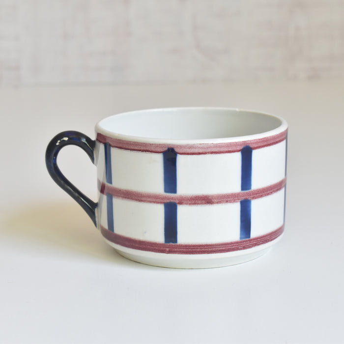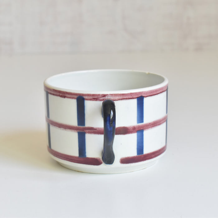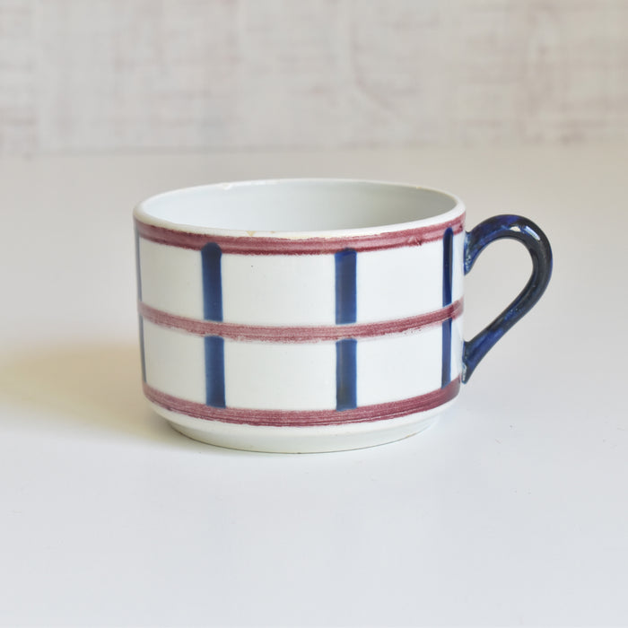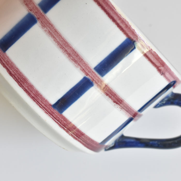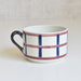 このカップは、白地に青とバーガンディのような赤のストライプが格子状に配された、バスク地方の伝統的な織物のような「バスク柄」が特徴です。