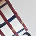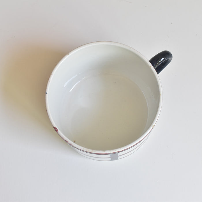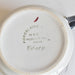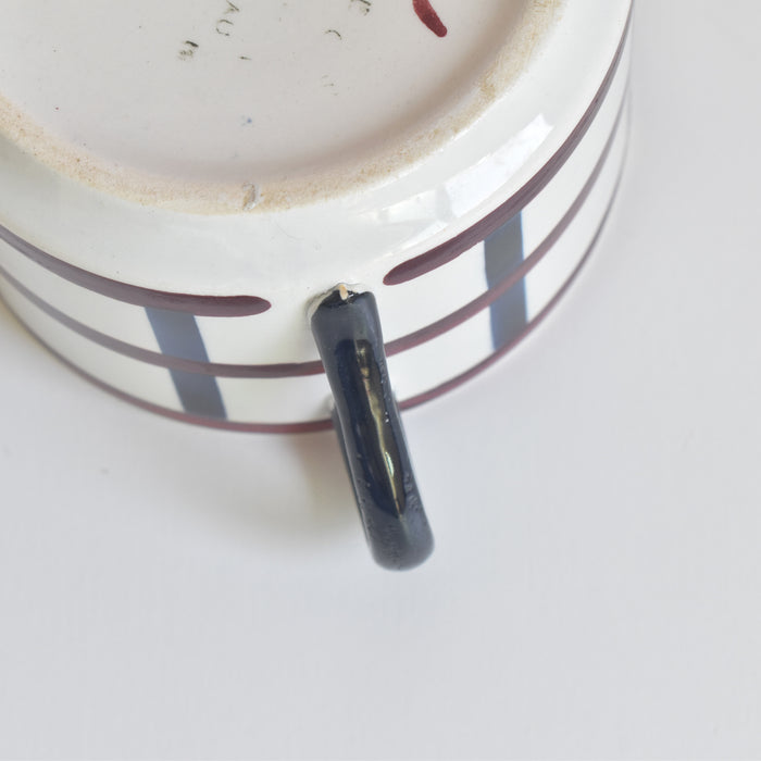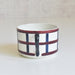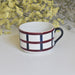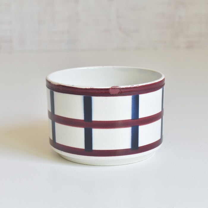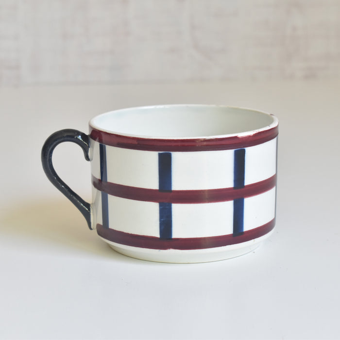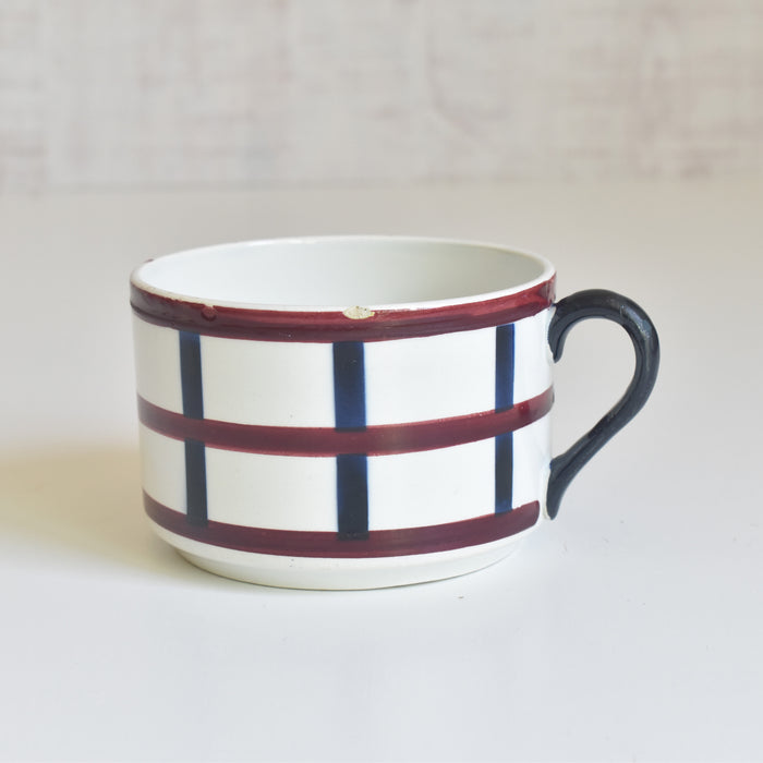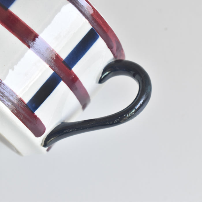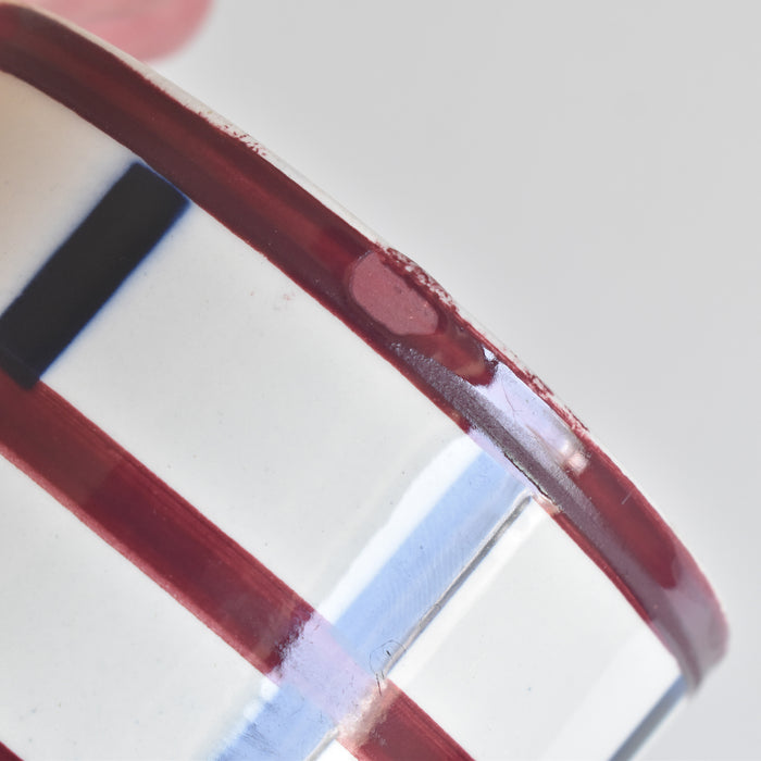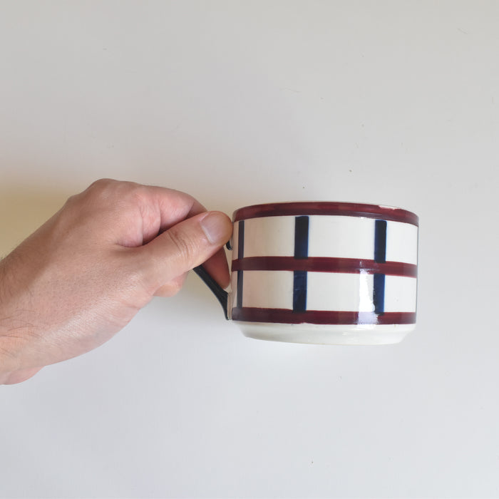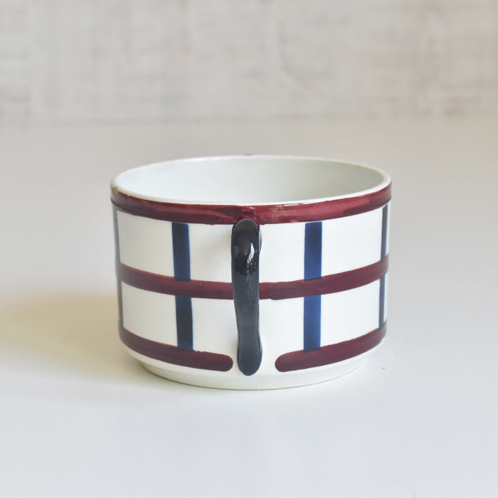 このカップは、白地に青とバーガンディのような赤のストライプが格子状に配された、バスク地方の伝統的な織物のような「バスク柄」が特徴です。