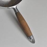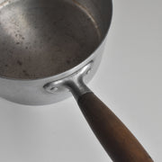 全体に広がる細かな傷、熱によって変化したアルミ特有の鈍い輝き、そして味わい深く色づいた木製ハンドル。